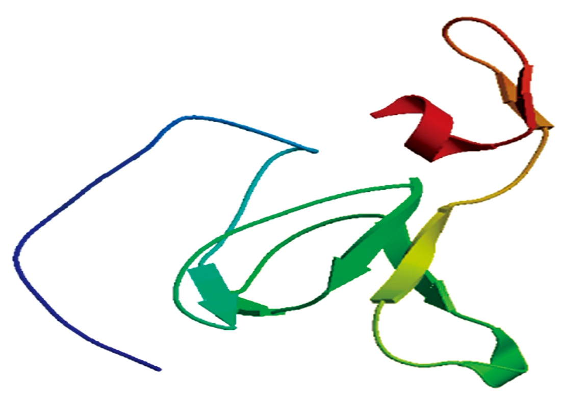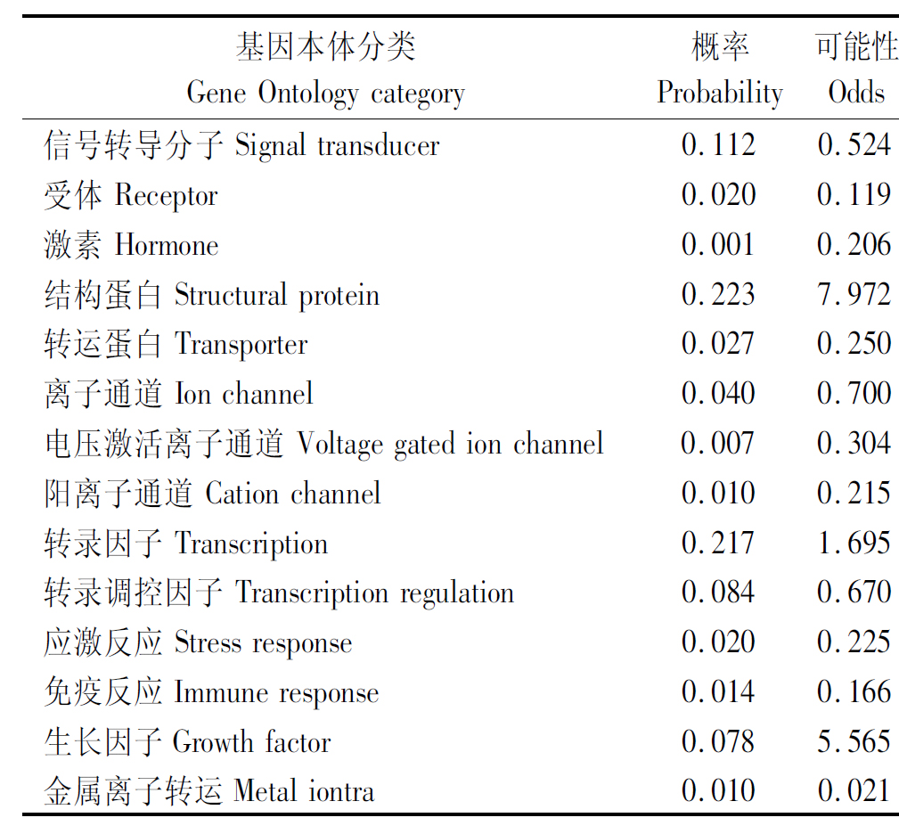 采用Protfun 2.2 Server软件对CTGF进行蛋白功能分类预测,结果显示,CTGF在运输和结合过程中的概率值为0.834,其次,在能量代谢过程中的概率值为0.122,推测CTGF在蛋白功能作用中主要参与机体的能量代谢、运输和结合等过程(表2);同时在CTGF基因编码蛋白基因本体分类结果中,发现CTGF在结构蛋白、转录因子和生长因子中概率值分别为0.223,0.217,0.078,说明CTGF可能作为结构蛋白、转录因子和生长因子,在机体中发挥功能(表3)。
