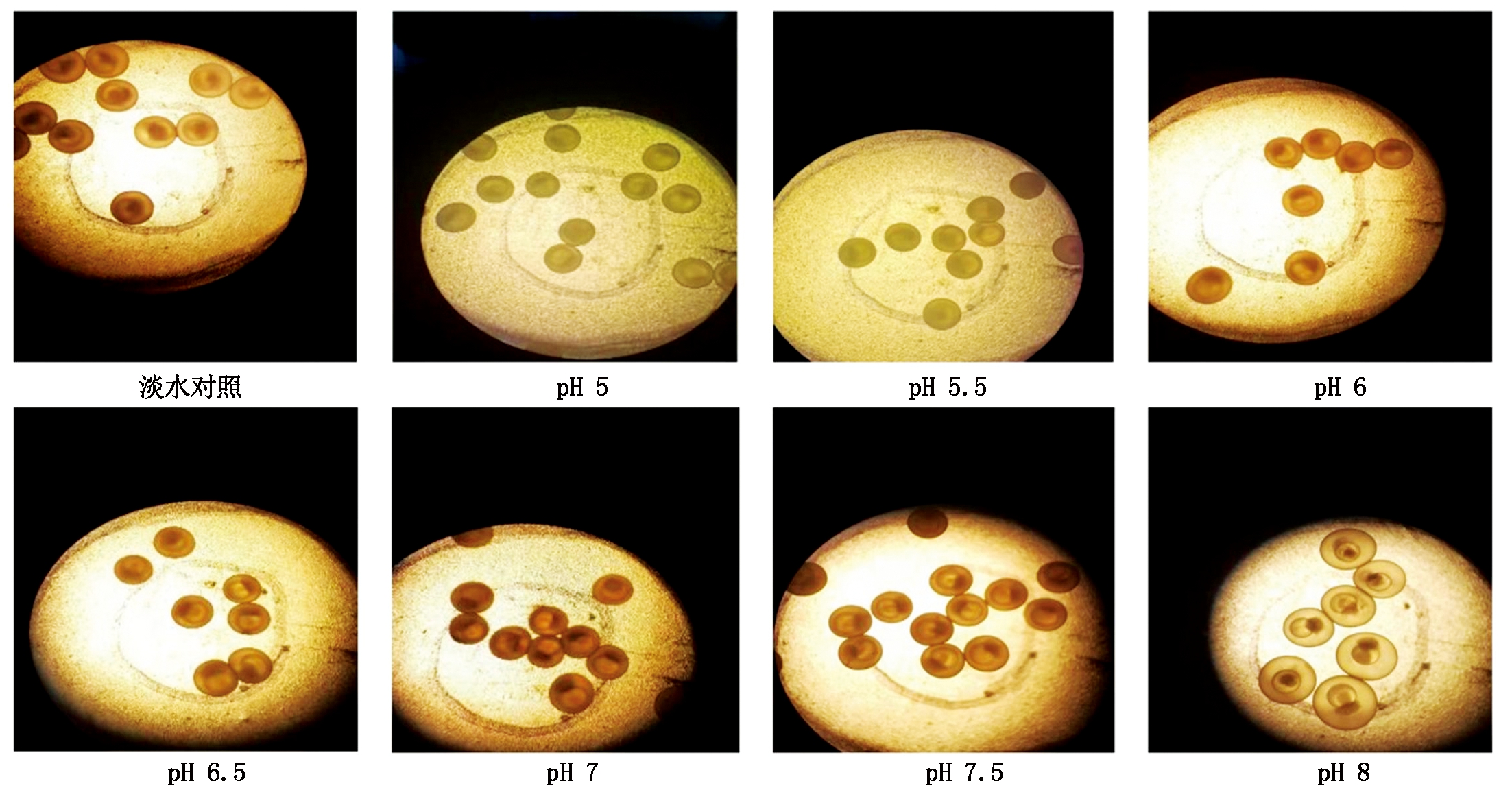 瓦氏雅罗鱼胚胎在pH值5.0~7.5,随着pH值的升高胚盘与腔体间隙有增大的趋势,但与对照组无显著性差异,当pH值为8胚胎显著膨胀(图5)。