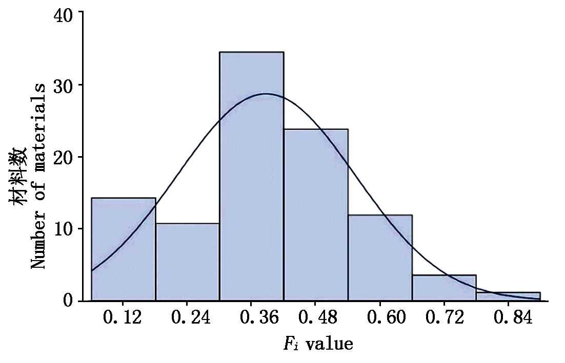 由表7,8可知,通过各性状隶属函数值分别得到84份豇豆种质资源的隶属函数均值(Fi),变幅为0.06~0.88,变异系数为43.07%,方差分析显示种质资源间Fi呈显著性差异(P<0. 01),表明豇豆种质资源间耐盐能力存在差异。84份豇豆种质资源的Fi呈连续性单峰分布(图3),65.48%的种质资源Fi分布在0.30~0.60,其中有8份Fi>0.60,有4份Fi<0.10。根据Fi大小,将耐盐能力进行强弱排序(表7),其中苏紫豇1号的Fi最大(0.88),表明其耐盐性最强;白线豆和二芦白的Fi最小(0.06),表明其耐盐性最弱。
