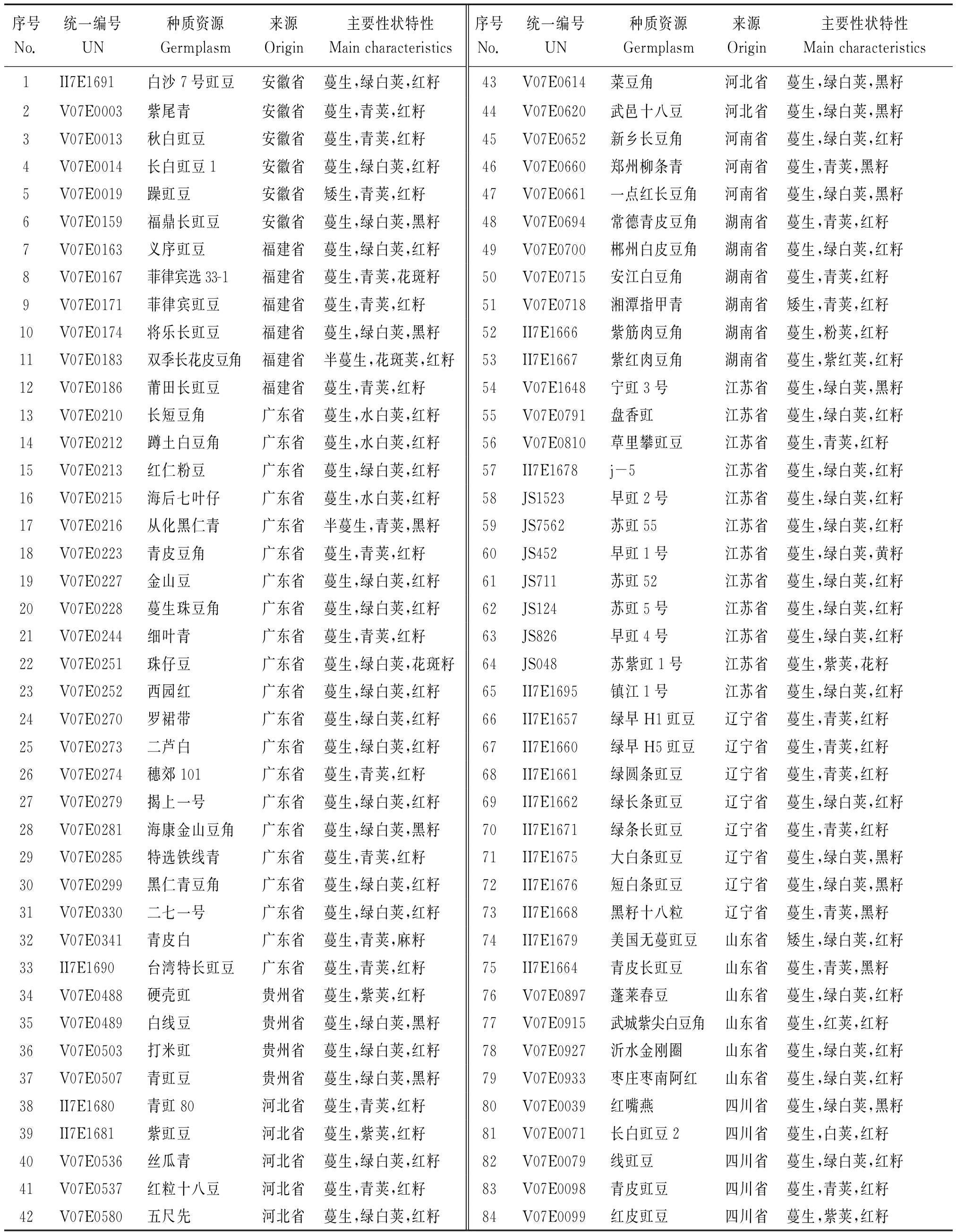 Tab.2 The origin and main characteristics of 84 yardlong bean germplasm resources