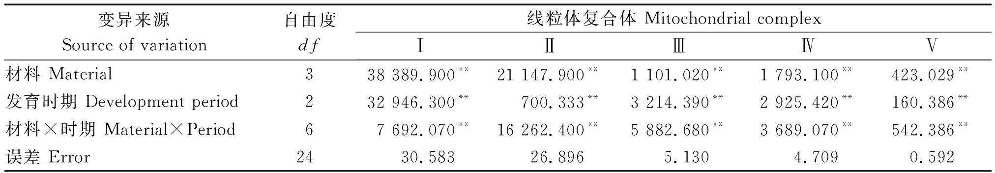 将各线粒体复合体活性方差分析结果列于表2。由表2可知,各复合体活性在材料间,发育时期间,材料×时期互作间差异均达到极显著水平,因此可进一步进行多重比较分析。