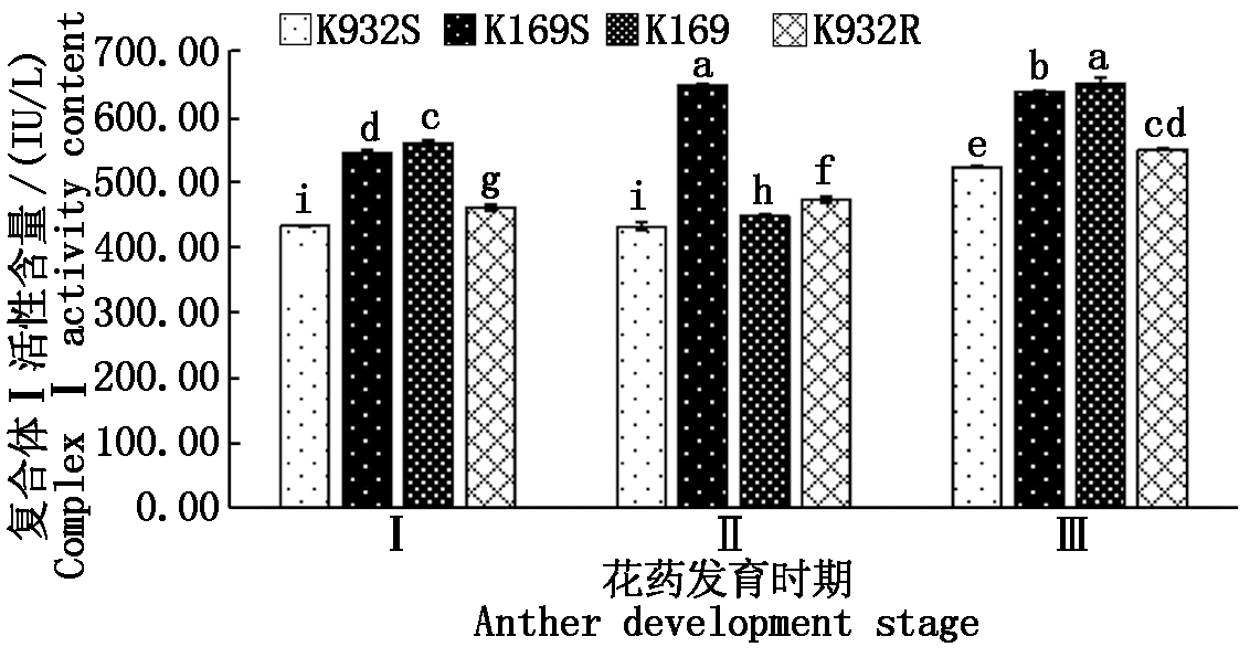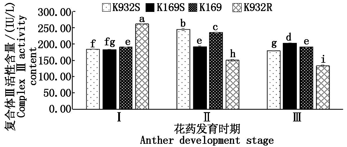 如图3所示,在花药发育过程中,不育系K932S和保持系K169中复合体Ⅲ活性呈先低后高再低的趋势,不育系K169S中呈逐渐增高的趋势,而恢复系K932R中呈逐渐降低的趋势。在花粉母细胞时期,不育系K932S显著低于恢复系K932R,不育系K169S显著低于保持系K169,而在四分体时期刚好相反。在二分体时期,不育系K932S显著高于恢复系K932R,但不育系K169S显著低于保持系K169,说明复合体Ⅲ活性变化可能与花粉败育直接相关。